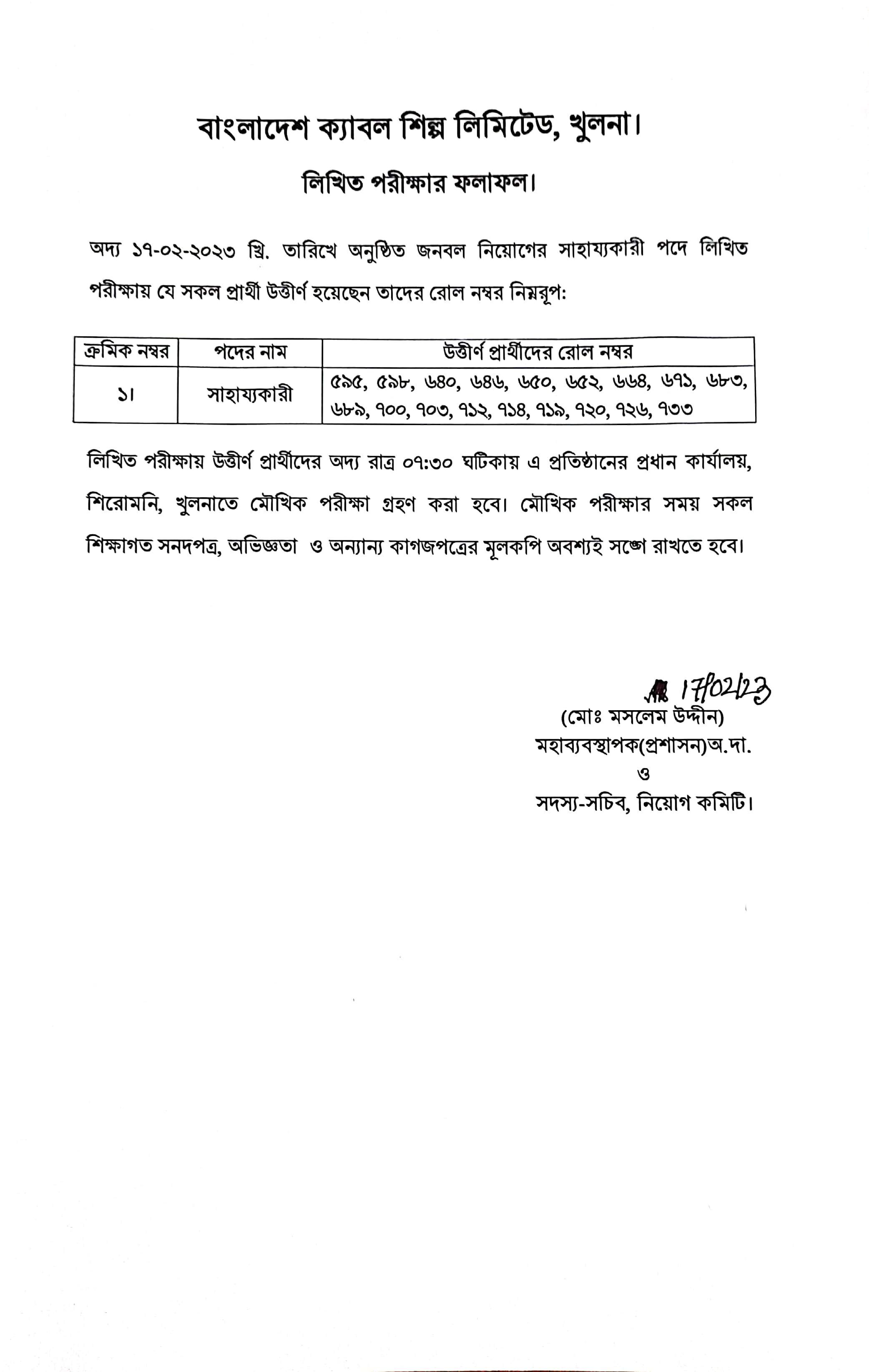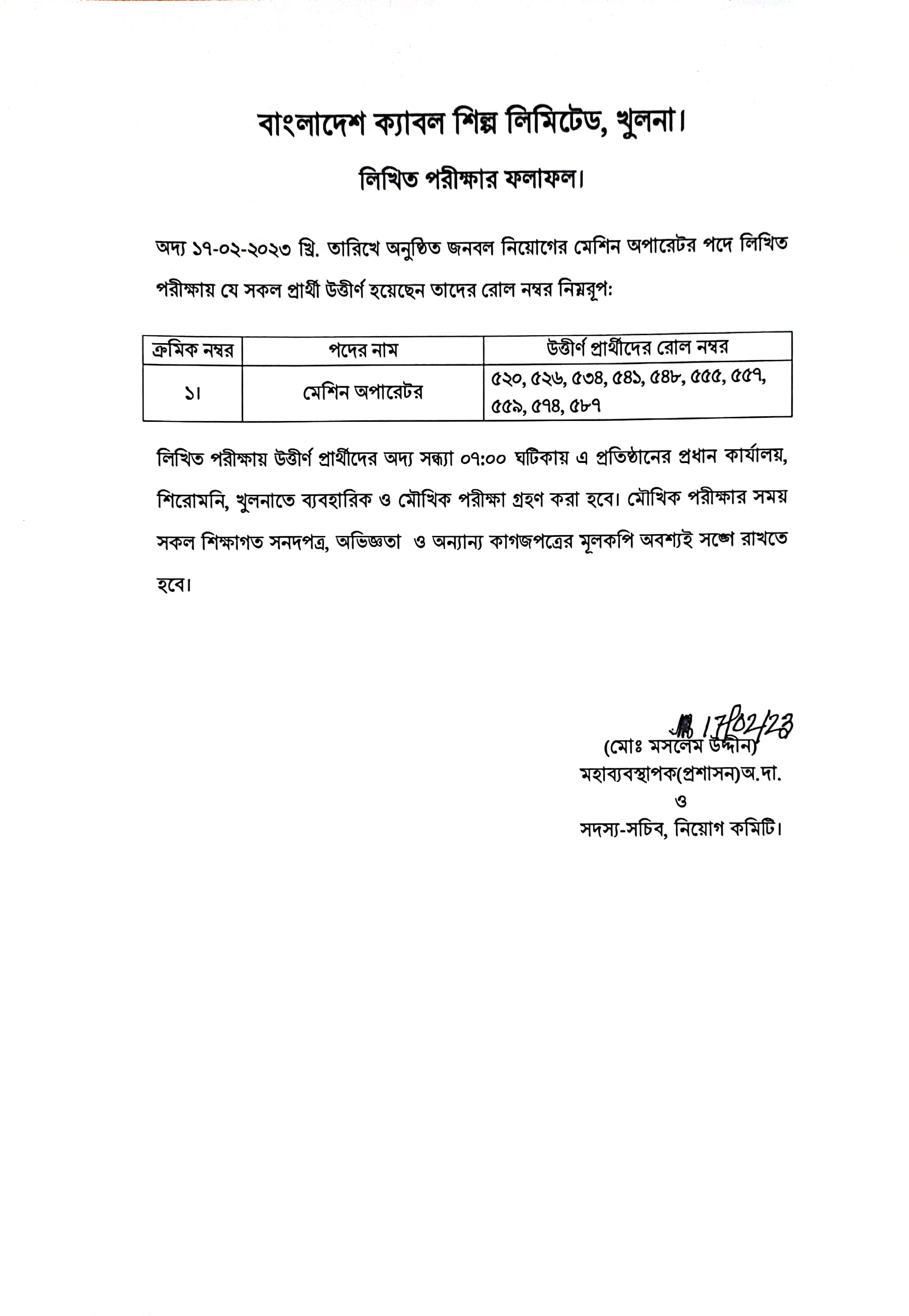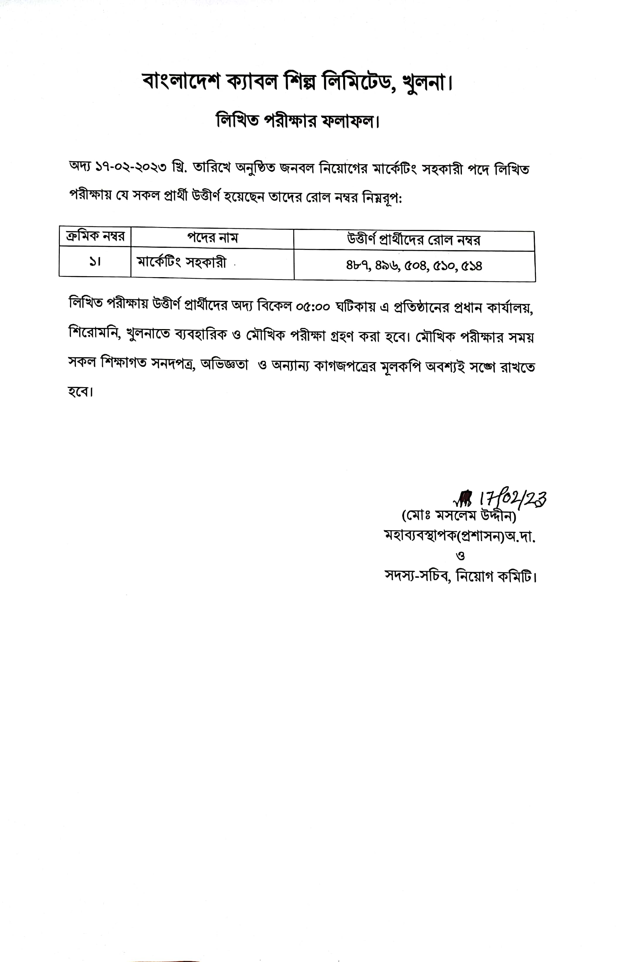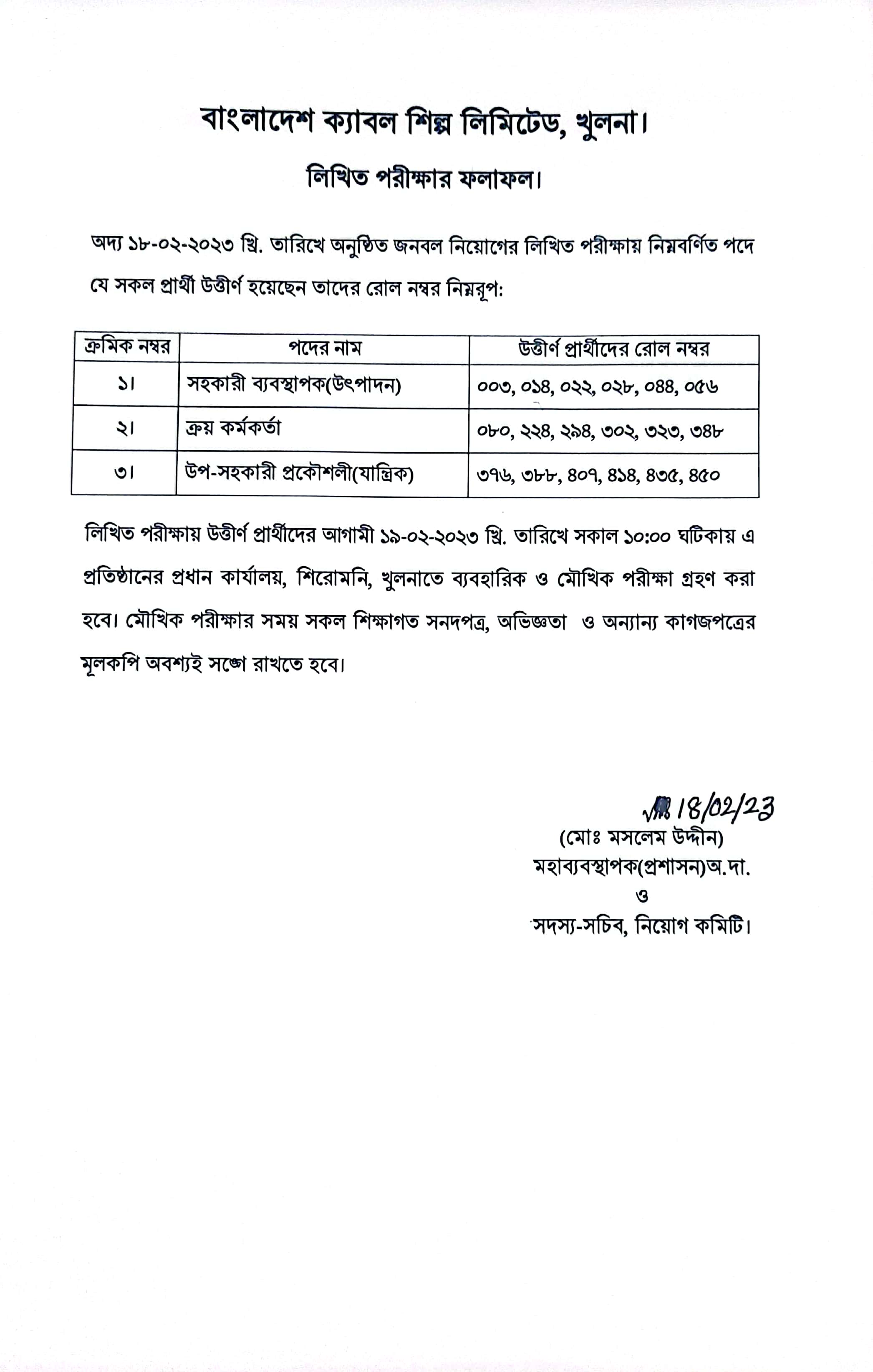 ১৮-০২-২০২৩ তারিখে বাংলাদেশ ক্যাবল শিল্প লিঃ এর সহকারী ব্যবস্থাপক(উৎপাদন), ক্রয় কর্মকর্তা ও উপ-সহকারী প্রকৌশলী (যান্ত্রিক) পদের লিখিত পরীক্ষার ফলাফল। উত্তীর্ণ প্রার্থীদের আগামীকাল সকাল ১০-০০ ঘটিকায় এ প্রতিষ্ঠানে ব্যবহারিক ও মৌখিক পরীক্ষা গ্রহণ করা হবে।